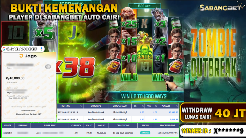 BUKTI KEMENANGAN 11 SEPTEMBER 2025 DI GAME ZOMBIE OUTBREAK ( POCKET GAME SOFT ) WD 40 JUTA