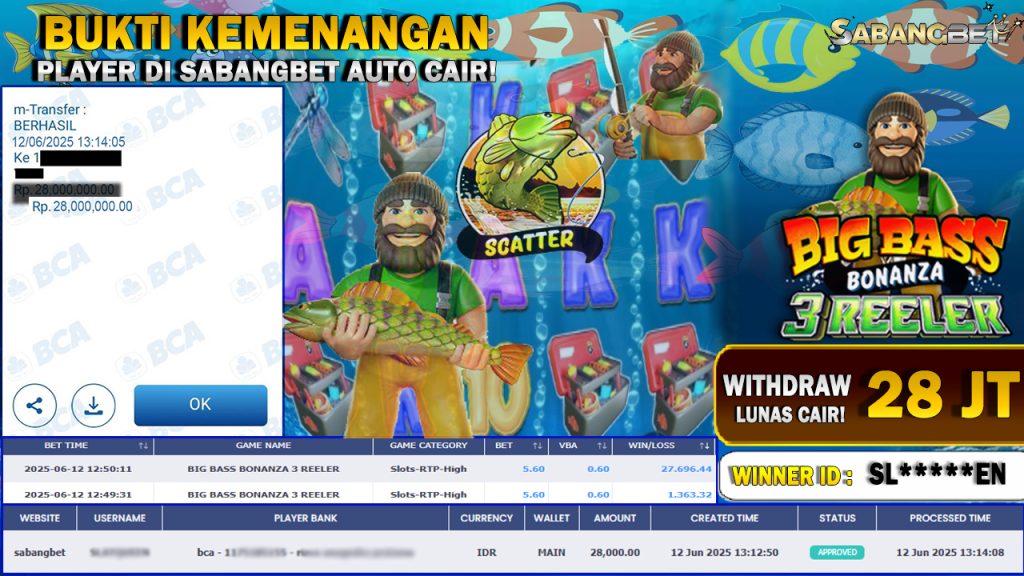 BUKTI KEMENANGAN 12 JUNI 2025 DI GAME BIG BASS BONANZA 3 REELER WD 28 JUTA