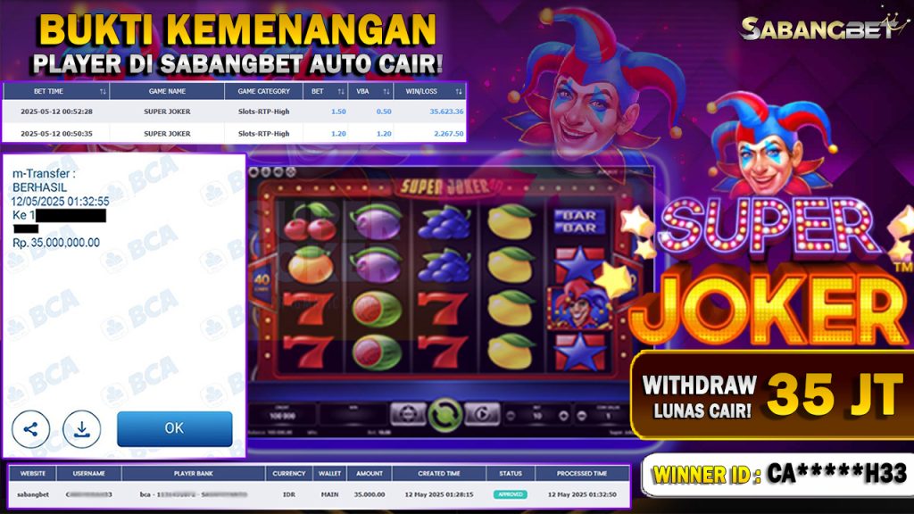 BUKTI KEMENANGAN 12 MEI 2025 DI GAME SUPER JOKER WD 35 JUTA