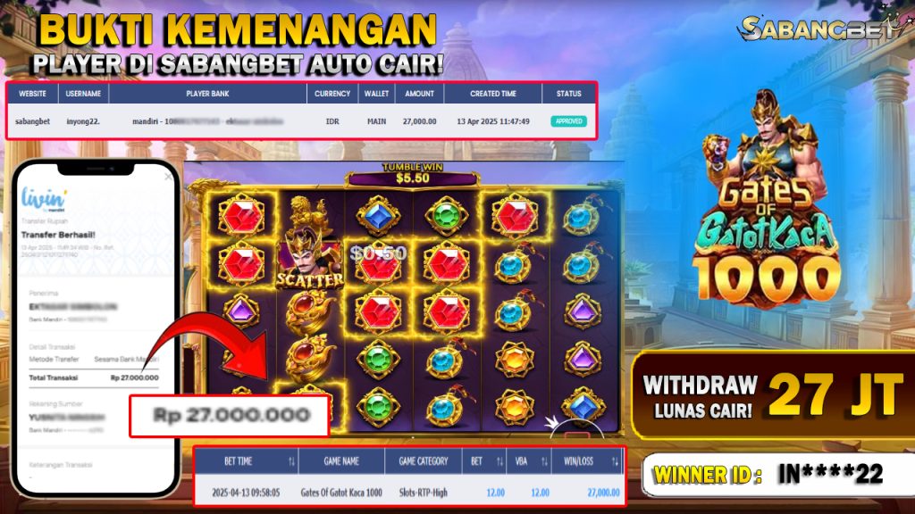 BUKTI KEMENANGAN 13 APRIL 2025 DI GAME GATES OF GATOT KACA 1000 WD 27 JUTA