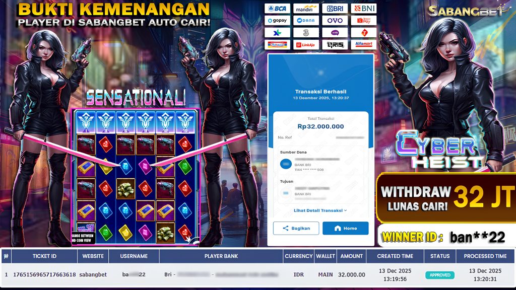 BUKTI KEMENANGAN 13 DESEMBER 2025 DI GAME CYBER HEIST WD 32 JUTA