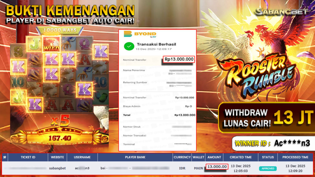 BUKTI KEMENANGAN 13 DESEMBER 2025 DI GAME Rooster Rumble WD 13 JUTA