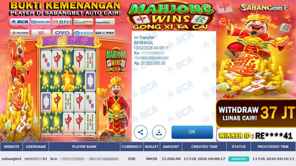 BUKTI KEMENANGAN 13 FEBRUARI 2026 DI GAME MAHJONG WINS – GONG XI FA CAI WD 37 JUTA