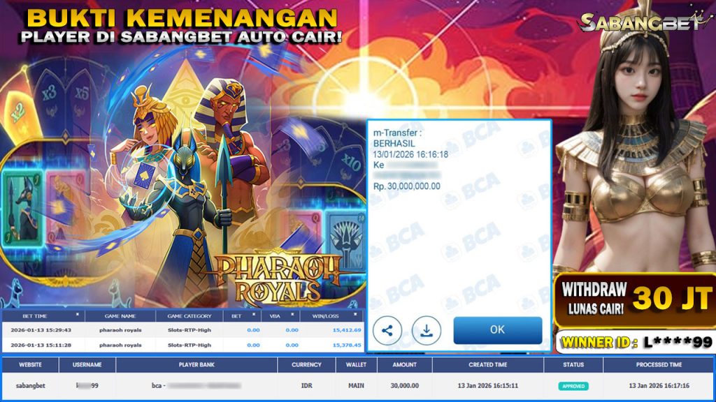 BUKTI KEMENANGAN 13 JANUARI 2026 DI GAME PHARAOH ROYALS WD 30 JUTA