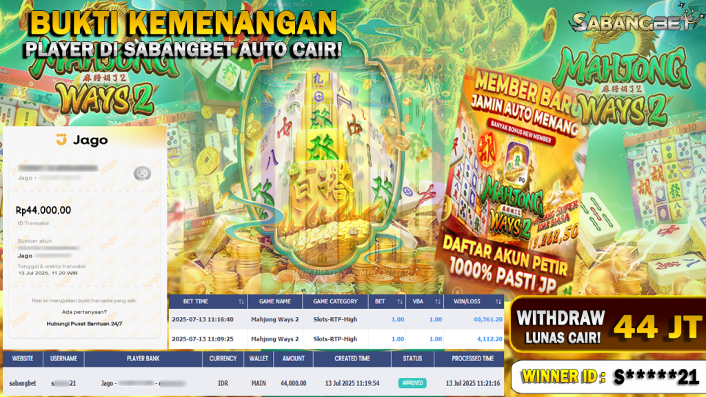 BUKTI KEMENANGAN 13 JULI 2025 DI MAHJONG WAYS 2 “PG SOFT” WD 44 JUTA