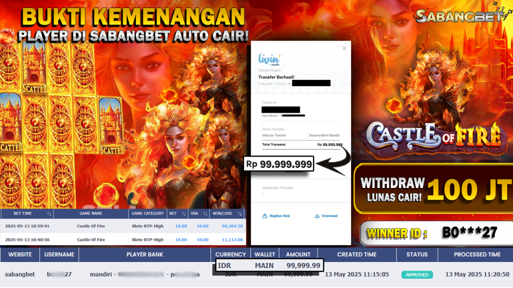 BUKTI KEMENANGAN 13 MEI 2025 DI GAME CASTLE OF FIRE, PRAMAGTIC PLAY WD 100 JT
