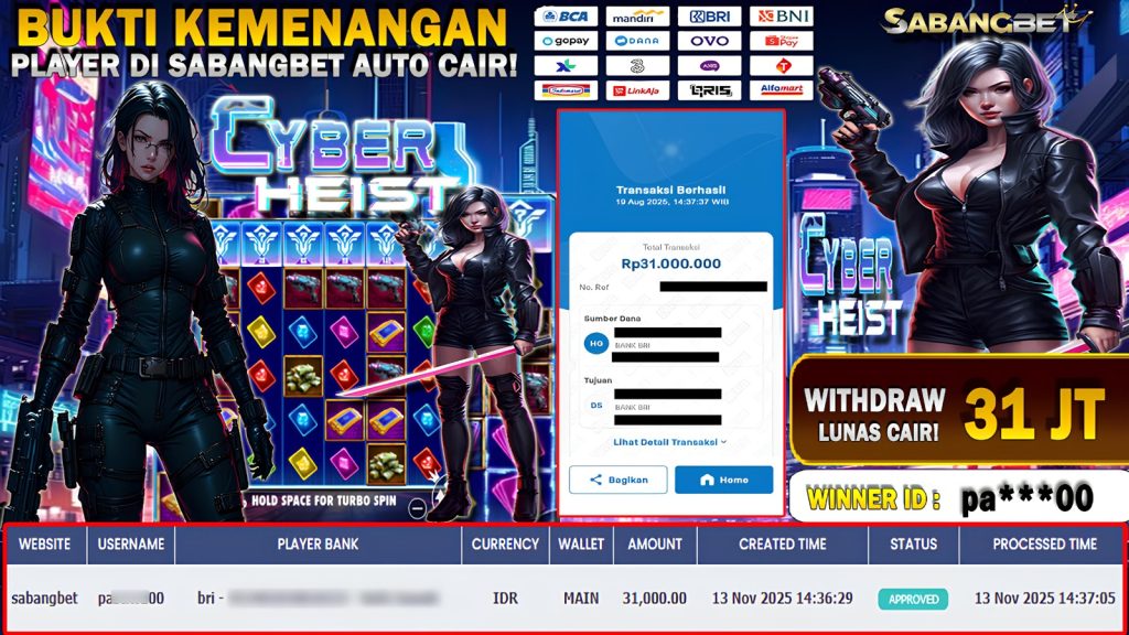 BUKTI KEMENANGAN 13 NOVEMBER 2025 DI GAME CYBER HEIST WD 31 JUTA