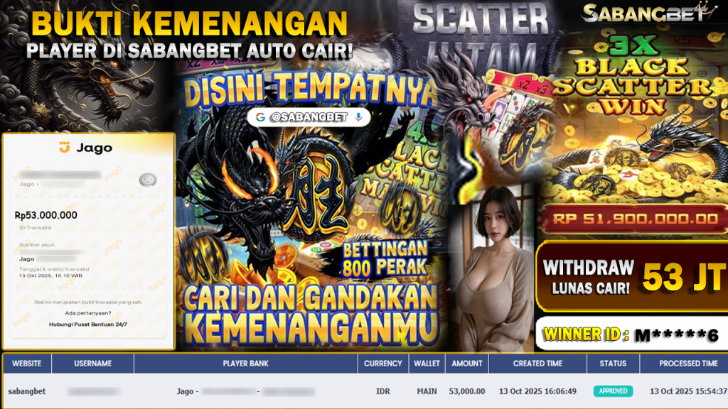 BUKTI KEMENANGAN 13 OKTOBER 2025 DI GAME MAHJONG WINS 3 – BLACK SCATTER ( PRAGMATIC PLAY ) WD 53 JUTA
