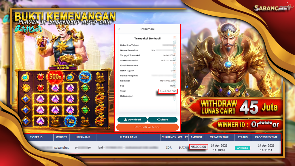 BUKTI KEMENANGAN 14 APRIL 2026 DI GAME Gates Of Gatotkaca WD 45 JUTA