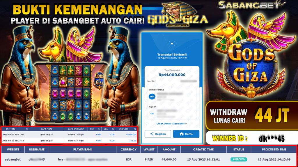 BUKTI KEMENANGAN 15 AGUSTUS 2025 DI GAME GODS OF GIZA WD 44 JUTA