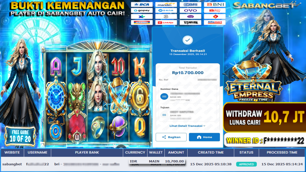 BUKTI KEMENANGAN 15 DESEMBER 2025 DI GAME ETERNAL EMPRESS – FREEZE TIME WD 10,7 JUTA