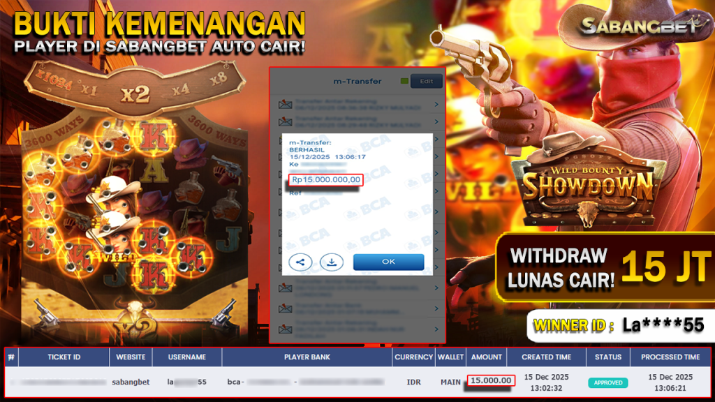 BUKTI KEMENANGAN 15 DESEMBER 2025 DI GAME Wild Bounty Showdown WD 15 JUTA