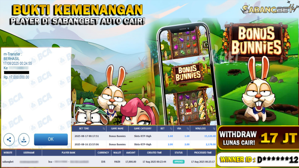 BUKTI KEMENANGAN 17 AGUSTUS 2025 DI GAME BONUS BUNNIES WD 17 JUTA