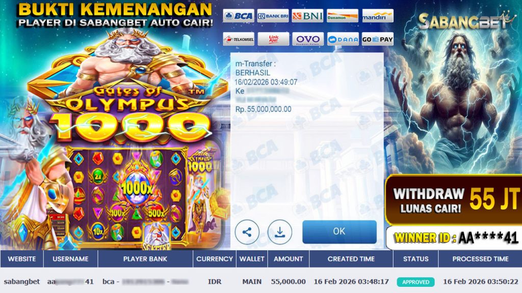 BUKTI KEMENANGAN 16 FEBRUARI 2026 DI GAME GATES OF OLYMPUS 1000 WD 55 JUTA
