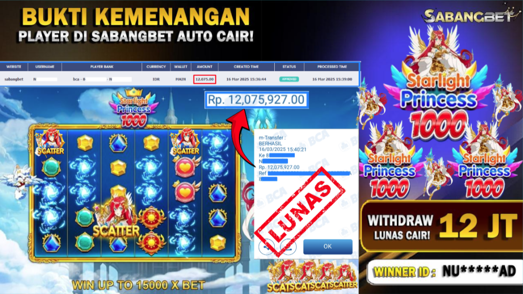 BUKTI KEMENANGAN 16 MARET 2025 DI GAME STARLIGHT PRINCESS 1000 WD 12 JT