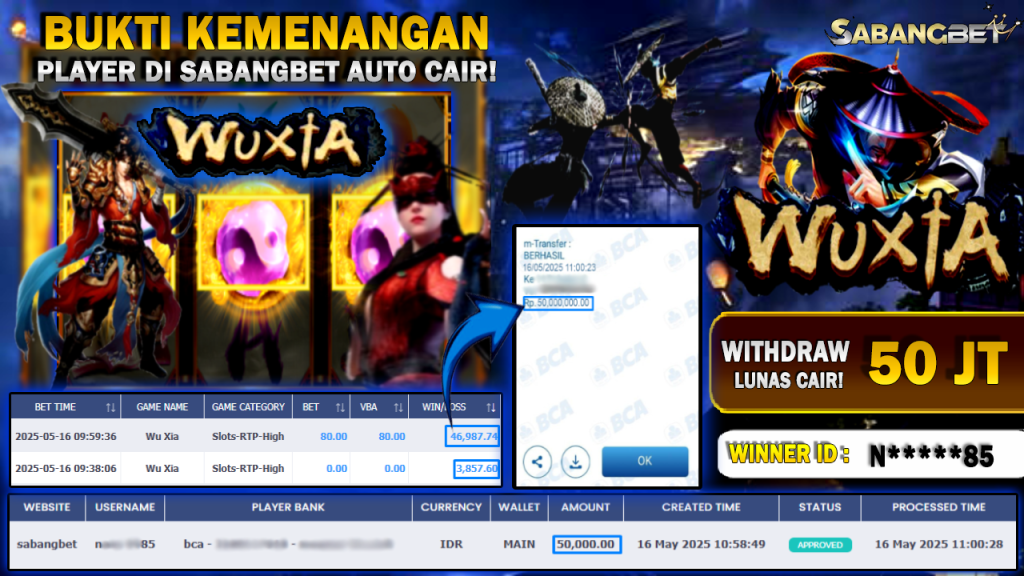 BUKTI KEMENANGAN 16 MEI 2025 DI GAME WU XIA WD 50 JUTA