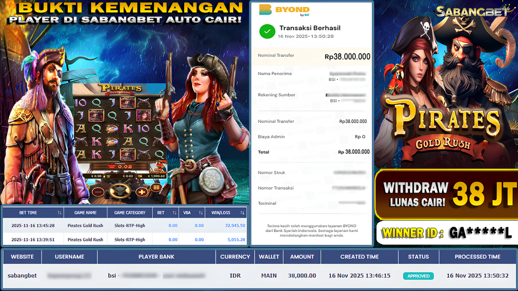 BUKTI KEMENANGAN 16 NOVEMBER 2025 DI GAME PIRATES GOLD RUSH WD 38 JUTA