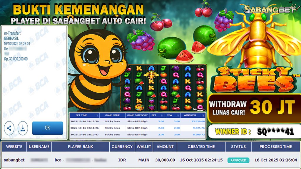 BUKTI KEMENANGAN 16 OKTOBER 2025 DI GAME STICKY BEES WD 30 JUTA
