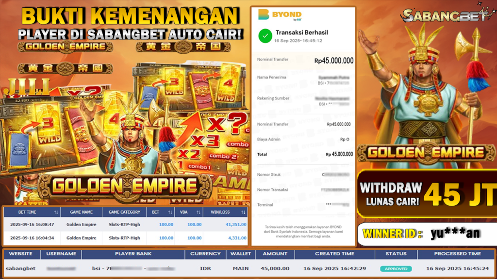 BUKTI KEMENANGAN 16 SEPTEMBER 2025 DI GAME GOLDEN EMPIRE WD 45 JUTA