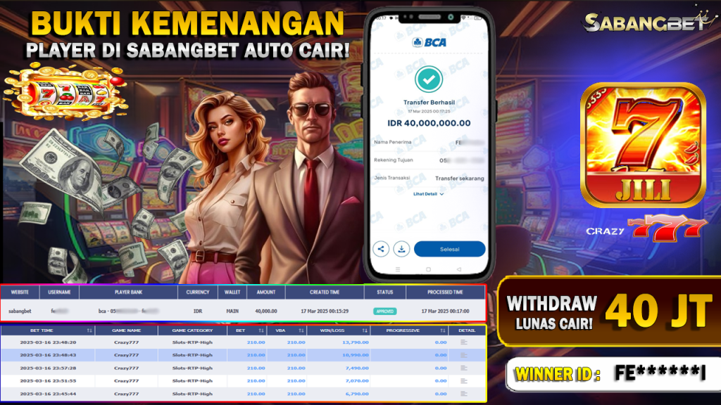 BUKTI KEMENANGAN 17 MARET 2025 DI GAME CRAZY 777 WD 40 JUTA