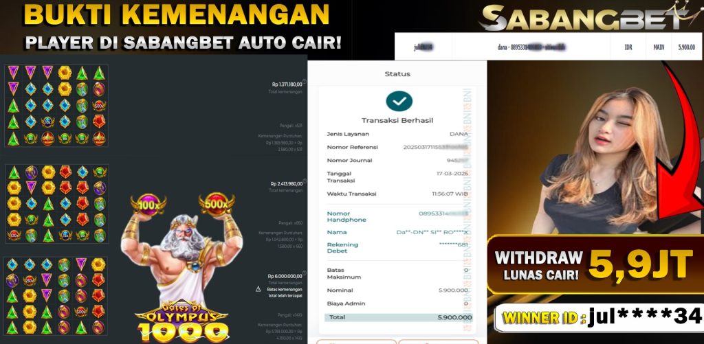 BUKTI KEMENANGAN 17 MARET 2025 DI GAME GATES OF OLYMPUS 1000 WD 5.9 JT