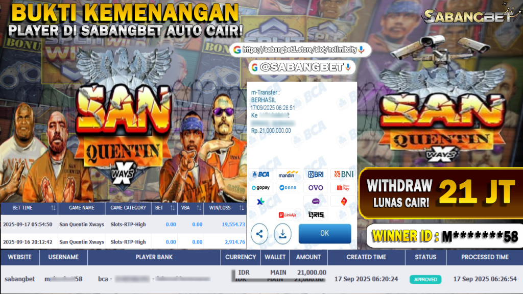 BUKTI KEMENANGAN 17 SEPTEMBER 2025 DI GAME SAN QUENTIN X WAYS WD 21 JUTA