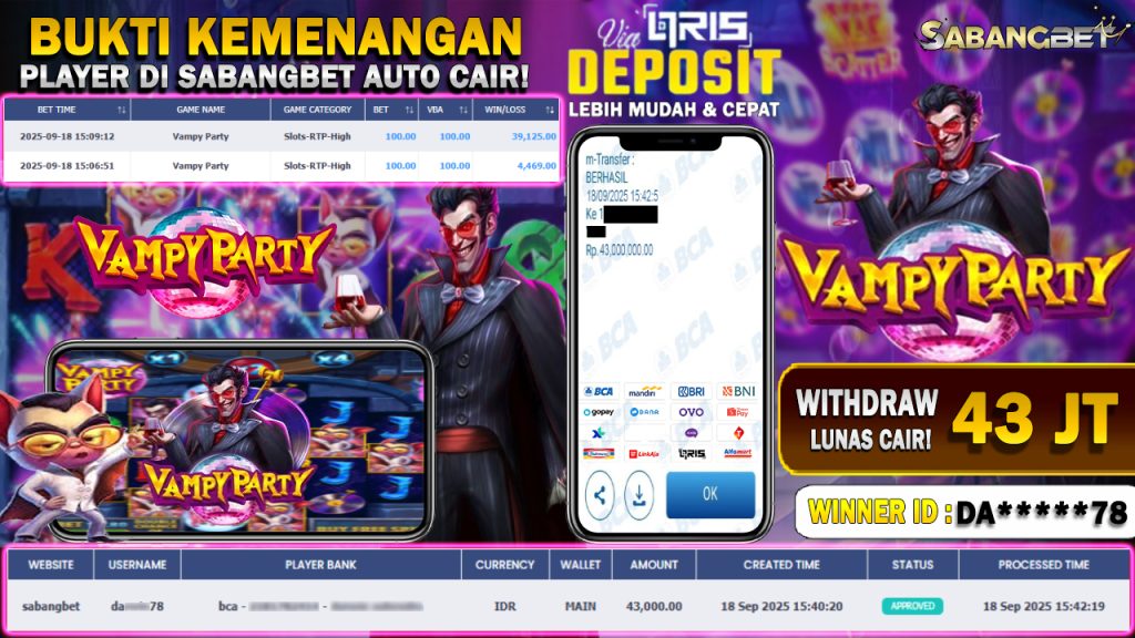 BUKTI KEMENANGAN 18 SEPTEMBER 2025 DI GAME VAMPY PARTY WD 43 JUTA