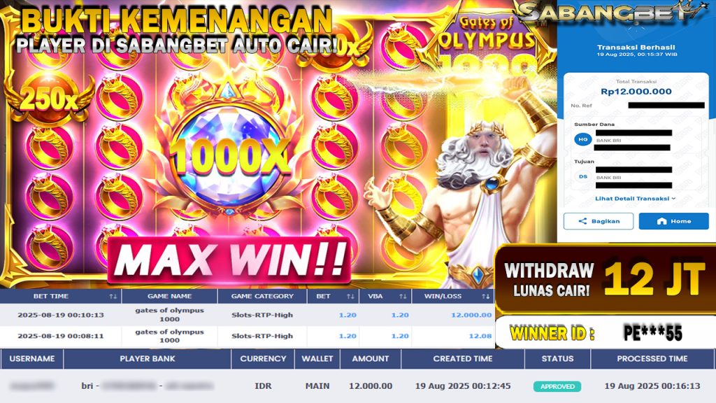 BUKTI KEMENANGAN 19 AGUSTUS 2025 DI GAME gates of olympus 1000 WD 12 JUTA
