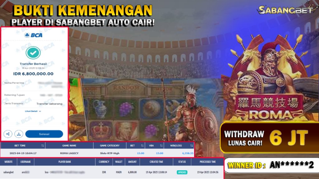 BUKTI KEMENANGAN 19 APRIL 2025 DI GAME ROMA LEGACY WD 6 JUTA