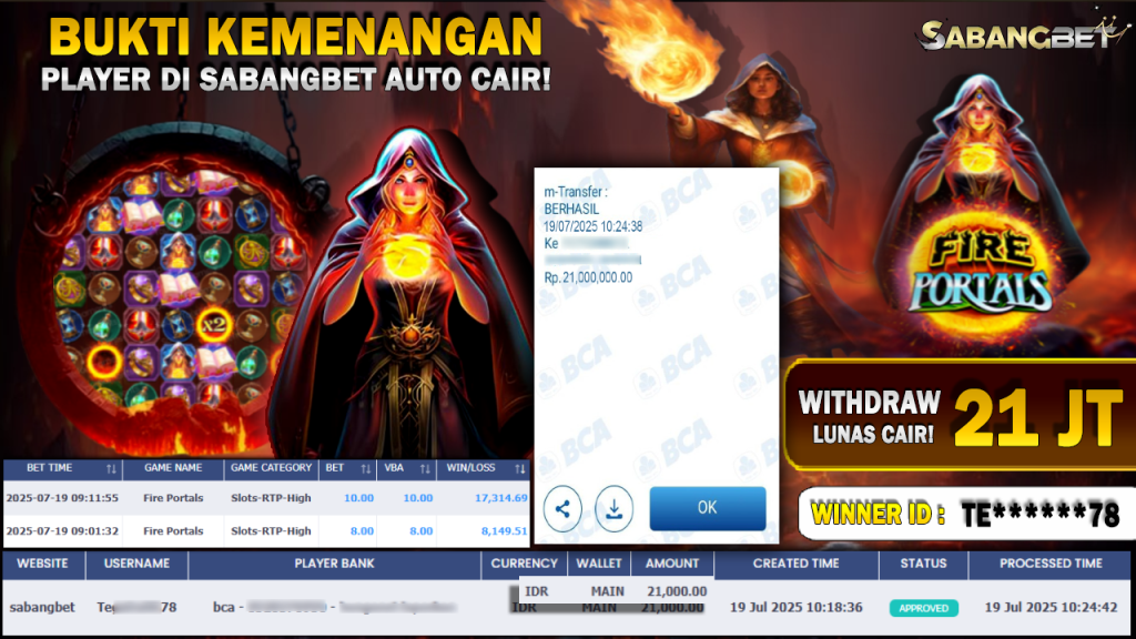 BUKTI KEMENANGAN 19 JULI 2025 DI GAME FIRE PORTALS WD 21 JUTA