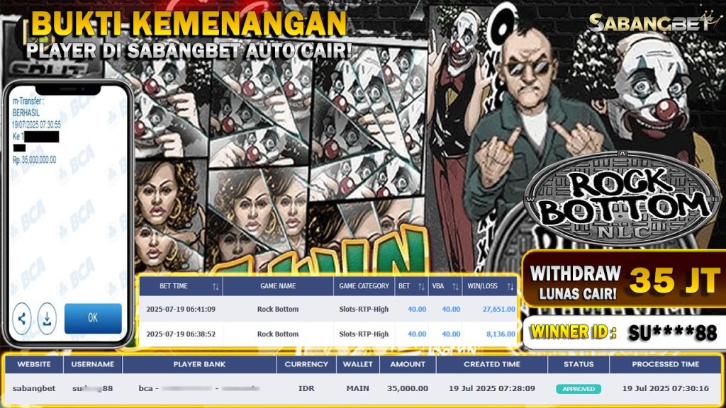 BUKTI KEMENANGAN 19 JULI 2025 DI GAME ROCK BOTTOM WD 35 JUTA