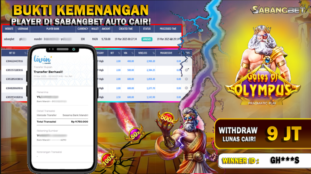 BUKTI KEMENANGAN 19 MARET 2025 DI GAME GATES OF OLYMPUS WD 9 JUTA