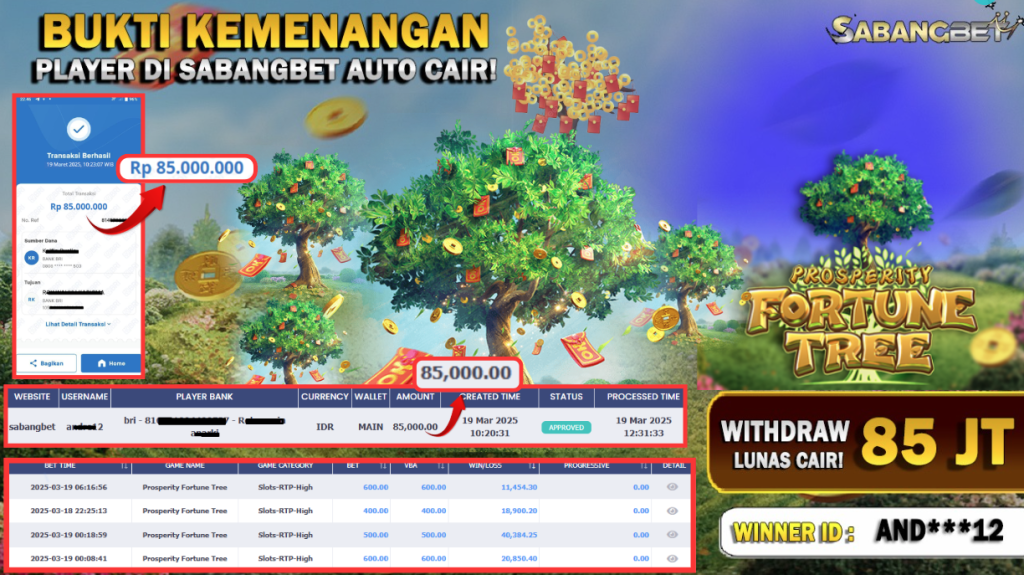 BUKTI KEMENANGAN 19 MARET 2025 DI GAME PROSPERITY FORTUNE TREE WD 85JUTA