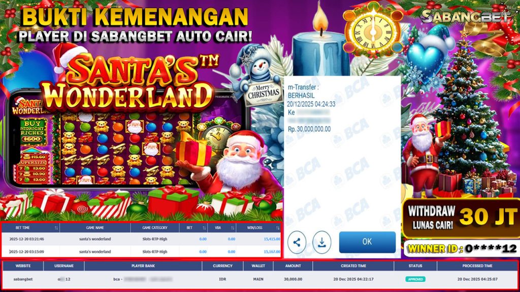 BUKTI KEMENANGAN 20 DESEMBER 2025 DI GAME SANTA’S WONDERLAND WD 30 JUTA