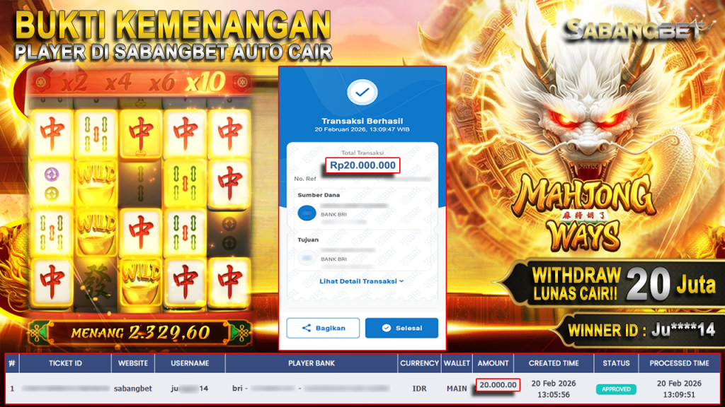 BUKTI KEMENANGAN 20 FEBRUARI 2026 DI GAME Mahjong Ways WD 20 JUTA