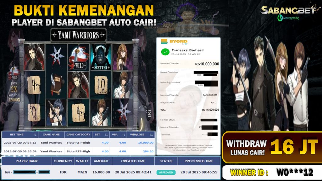 BUKTI KEMENANGAN 20 JULI 2025 DI GAME Yami Warriors WD 16 JUTA