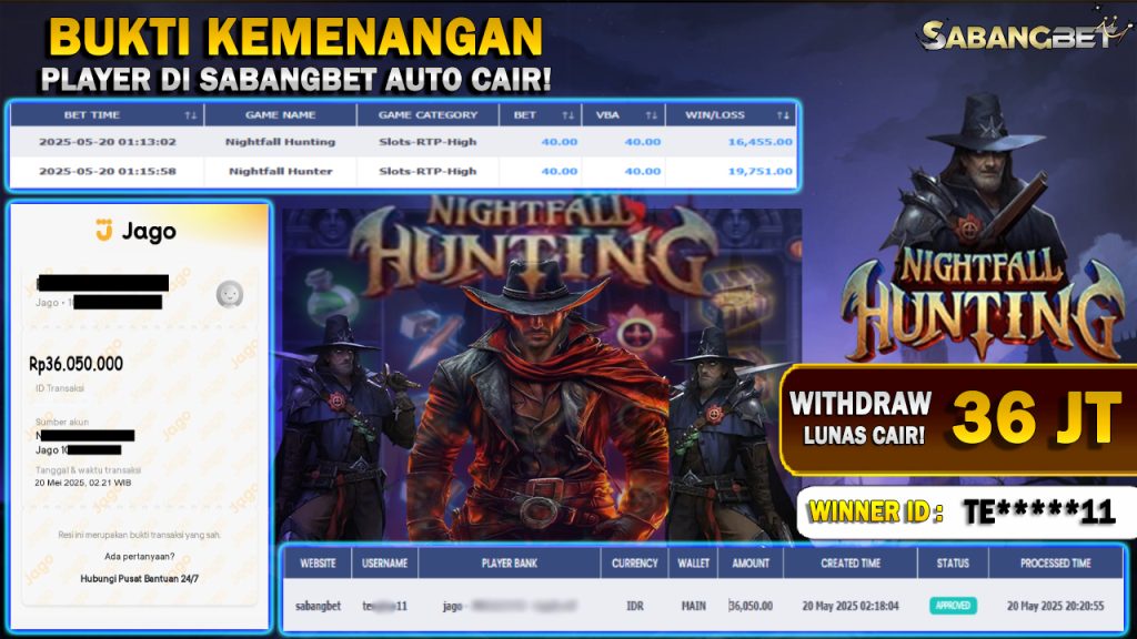 BUKTI KEMENANGAN 20 MEI 2025 DI GAME NIGHTFALL HUNTING WD 36 JUTA