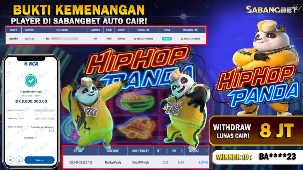 BUKTI KEMENANGAN 21 APRIL 2025 DI GAME HIP HOP PANDA WD 8 JT