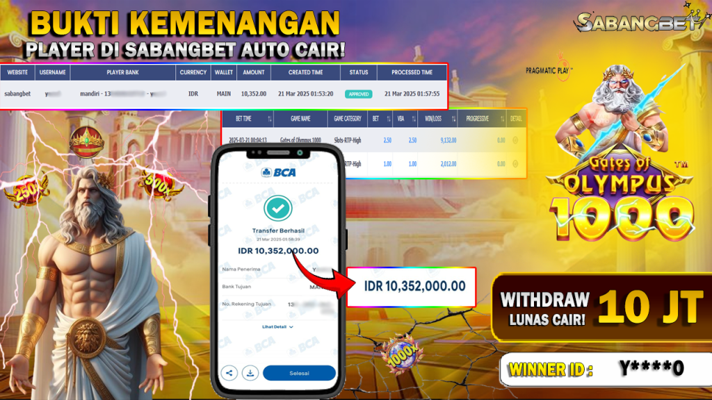 BUKTI KEMENANGAN 21 MARET 2025 DI GAME GATE OF OLYMPUS 1000 WD 10 JUTA