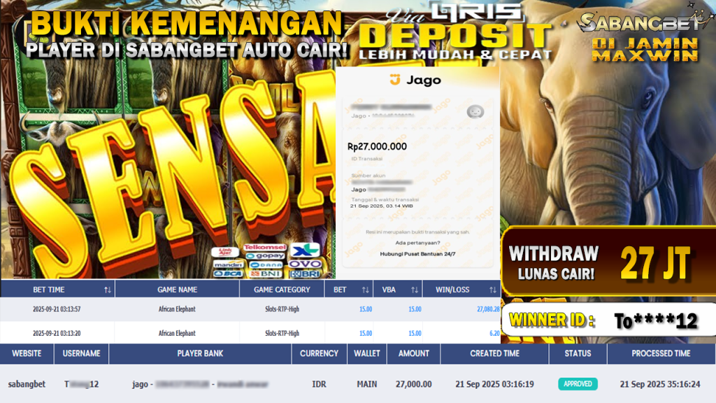 BUKTI KEMENANGAN 21 SEPTEMBER 2025 DI GAME AFRICAN ELEPHANT WD 27 JUTA