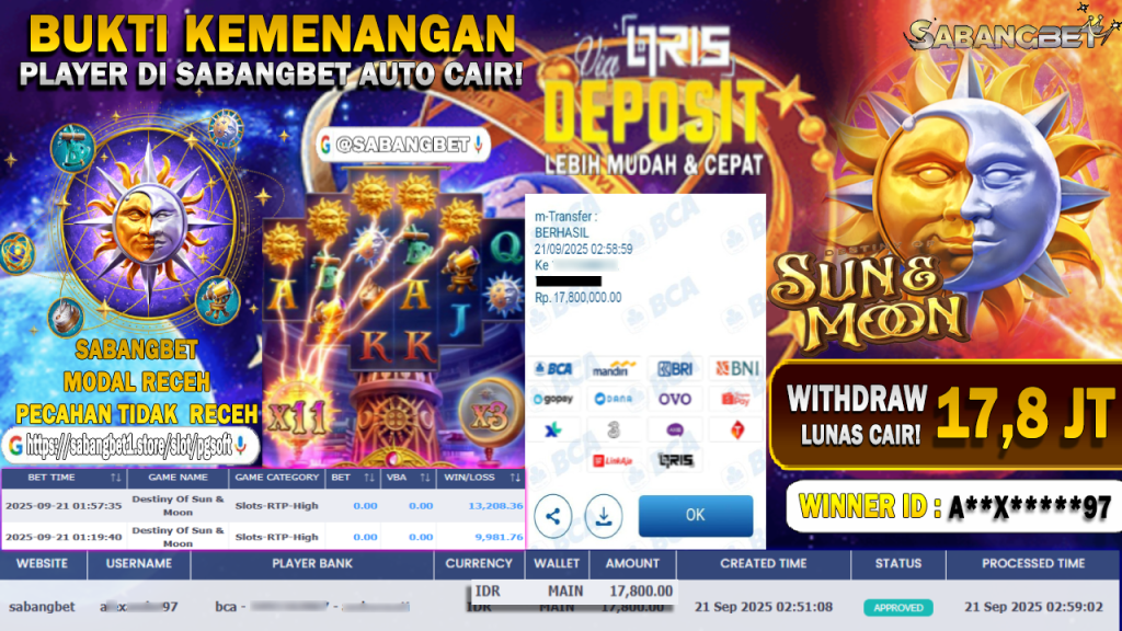 BUKTI KEMENANGAN 21 SEPTEMBER 2025 DI GAME DESTINY OF SUN & MOON WD 17,8 JUTA