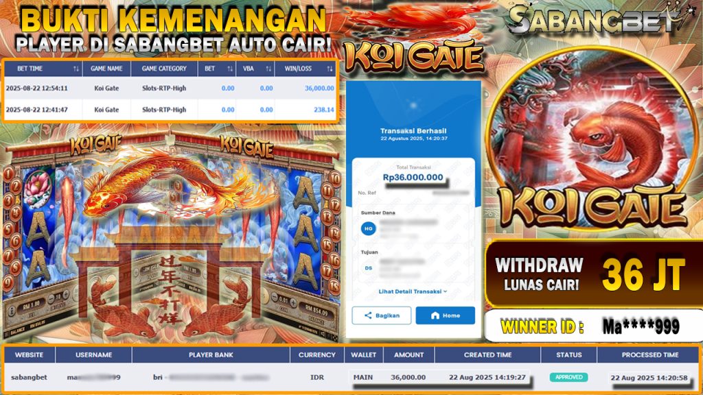 BUKTI KEMENANGAN 22 AGUSTUS 2025 DI GAME KOI GATE WD 36 JUTA