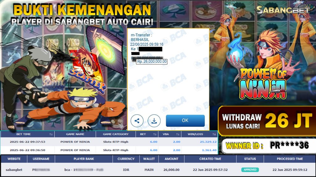 BUKTI KEMENANGAN 22 JUNI 2025 DI GAME POWER OF NINJA ’PG SOFT’ WD 26 JUTA