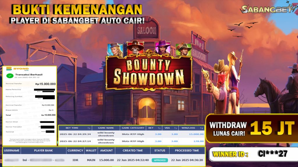 BUKTI KEMENANGAN 22 JUNI 2025 DI GAME wild bounty showdown WD 15 JUTA