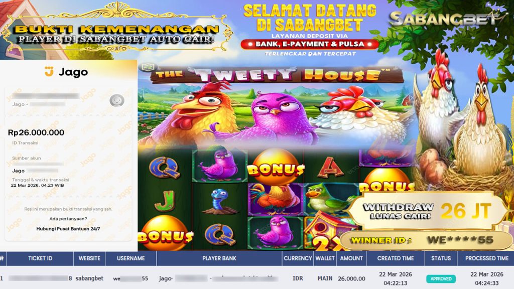 BUKTI KEMENANGAN 22 MARET 2026 DI GAME THE TWEETY HOUSE WD 26 JUTA