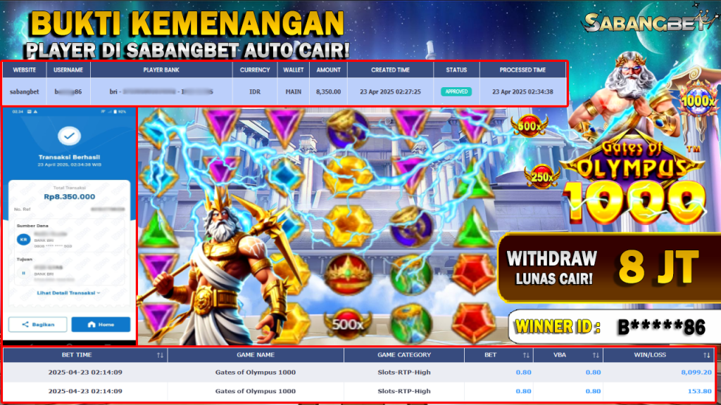 BUKTI KEMENANGAN 23 APRIL 2025 DI GAME GATES OF OLYMPUS 1000 WD 8 JUTA
