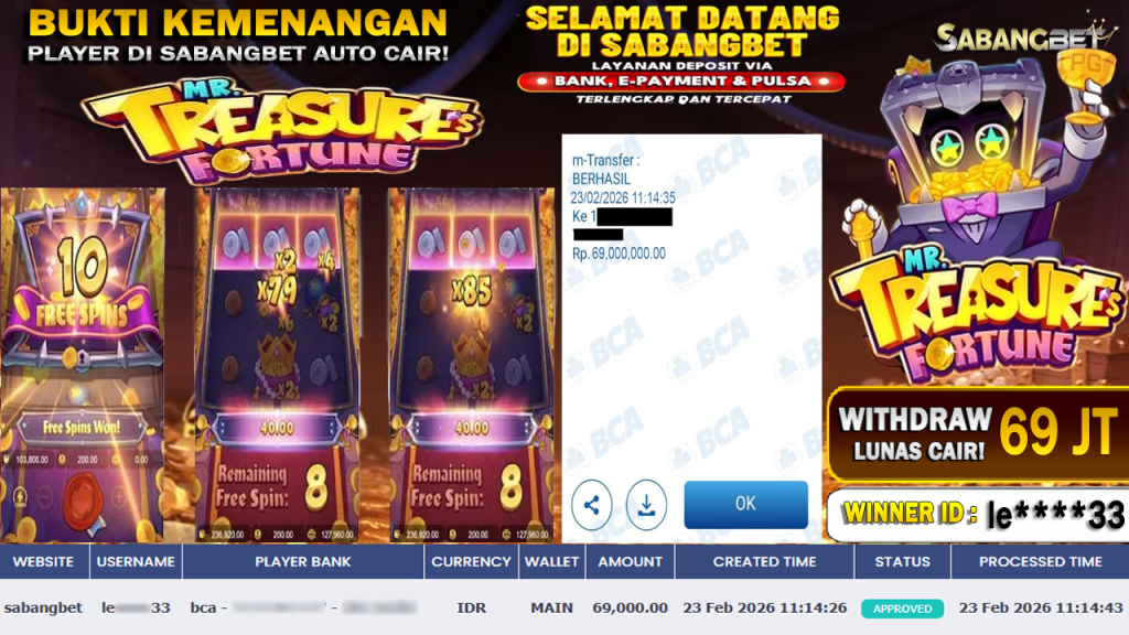 BUKTI KEMENANGAN 23 FEBRUARI 2026 DI GAME MR.TREASURES FORTUNRE WD 69 JUTA