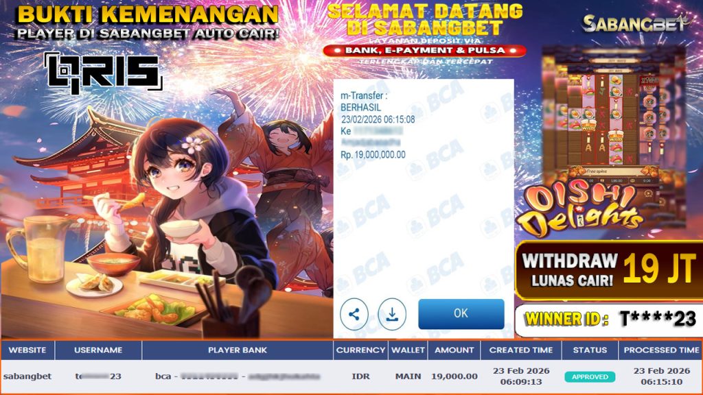 BUKTI KEMENANGAN 23 FEBRUARI 2026 DI GAME OISHI DELIGHTS WD 19 JUTA