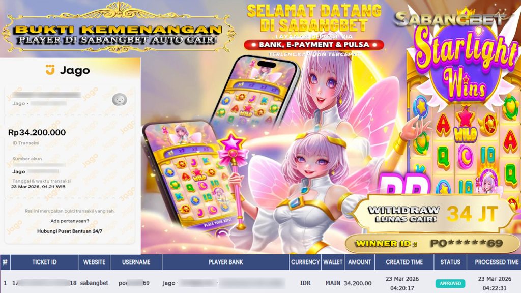 BUKTI KEMENANGAN 23 MARET 2026 DI GAME STARLIGHT WINS WD 34 JUTA