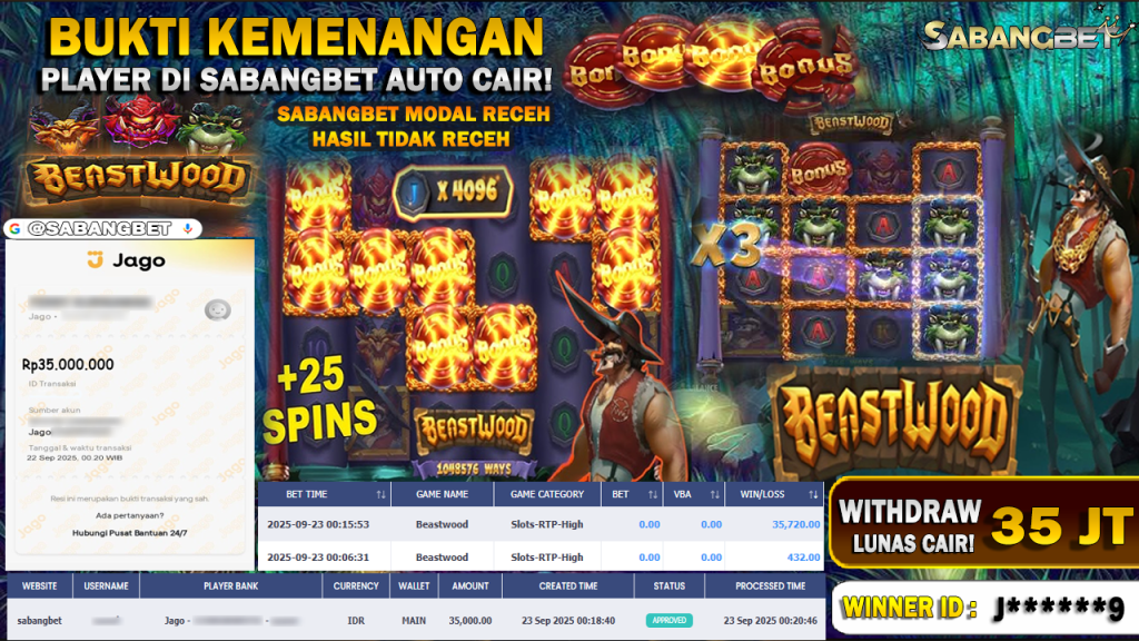 BUKTI KEMENANGAN 23 SEPTEMBER 2025 DI GAME BEASTWOOD ( PLAYTECH SLOT ) WD 35 JUTA